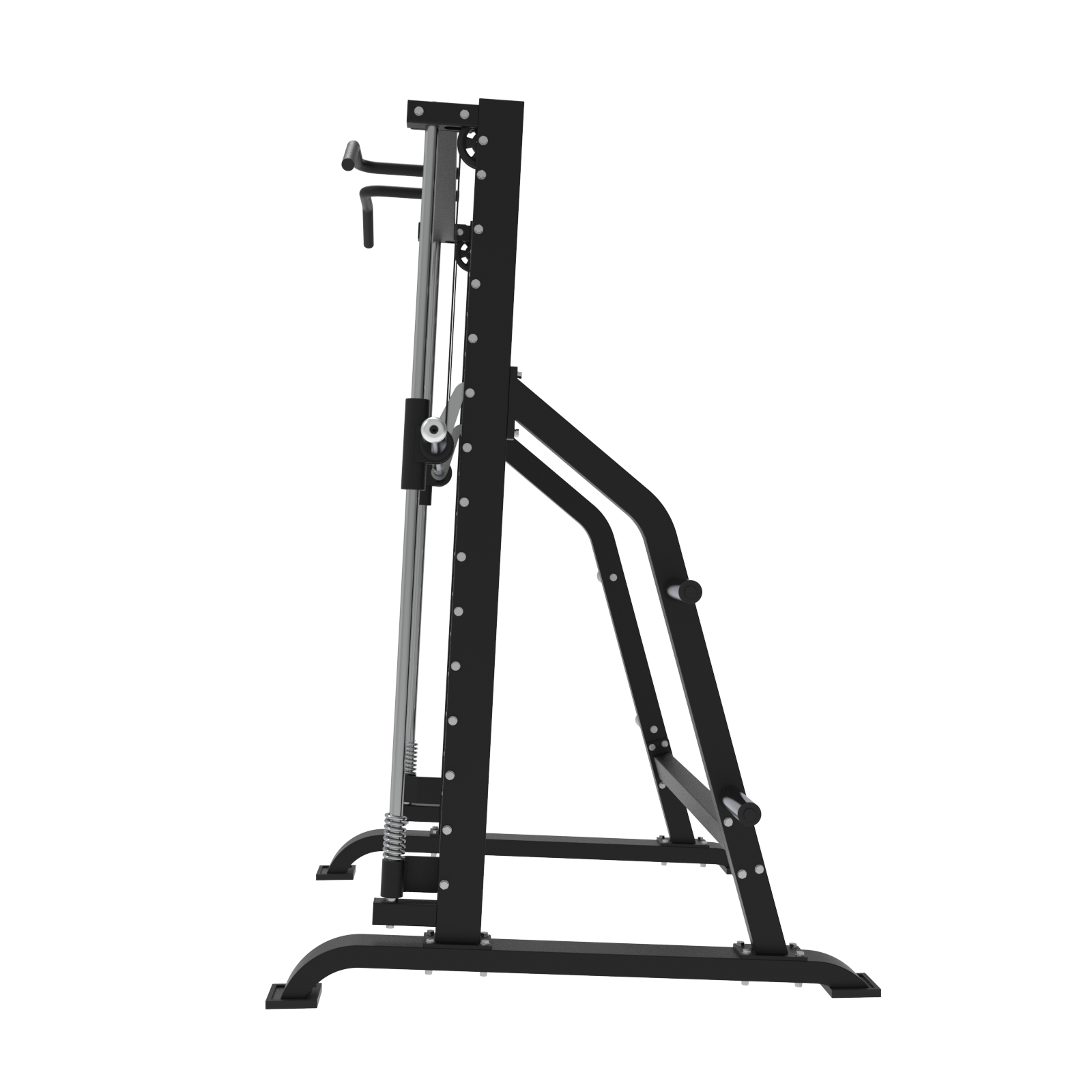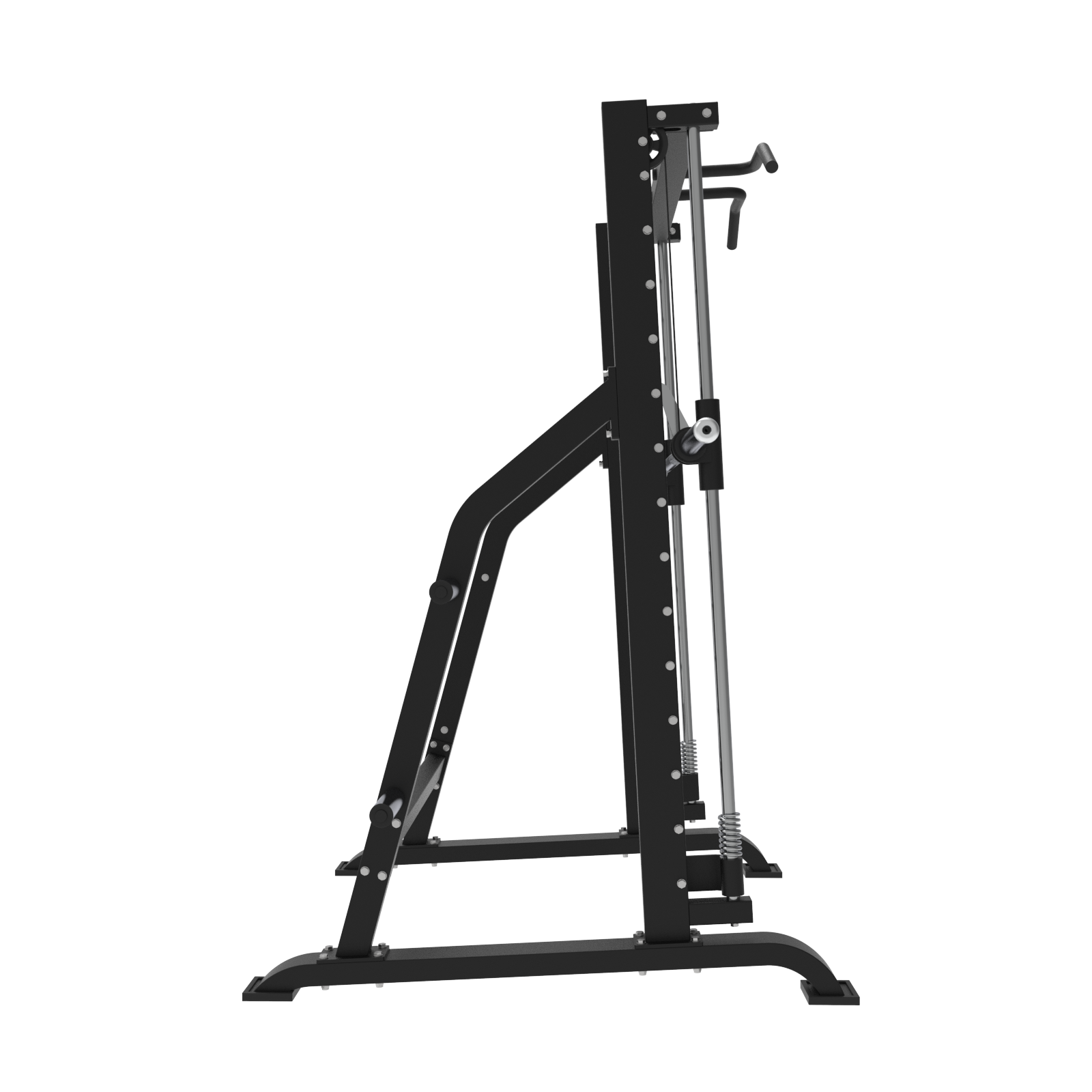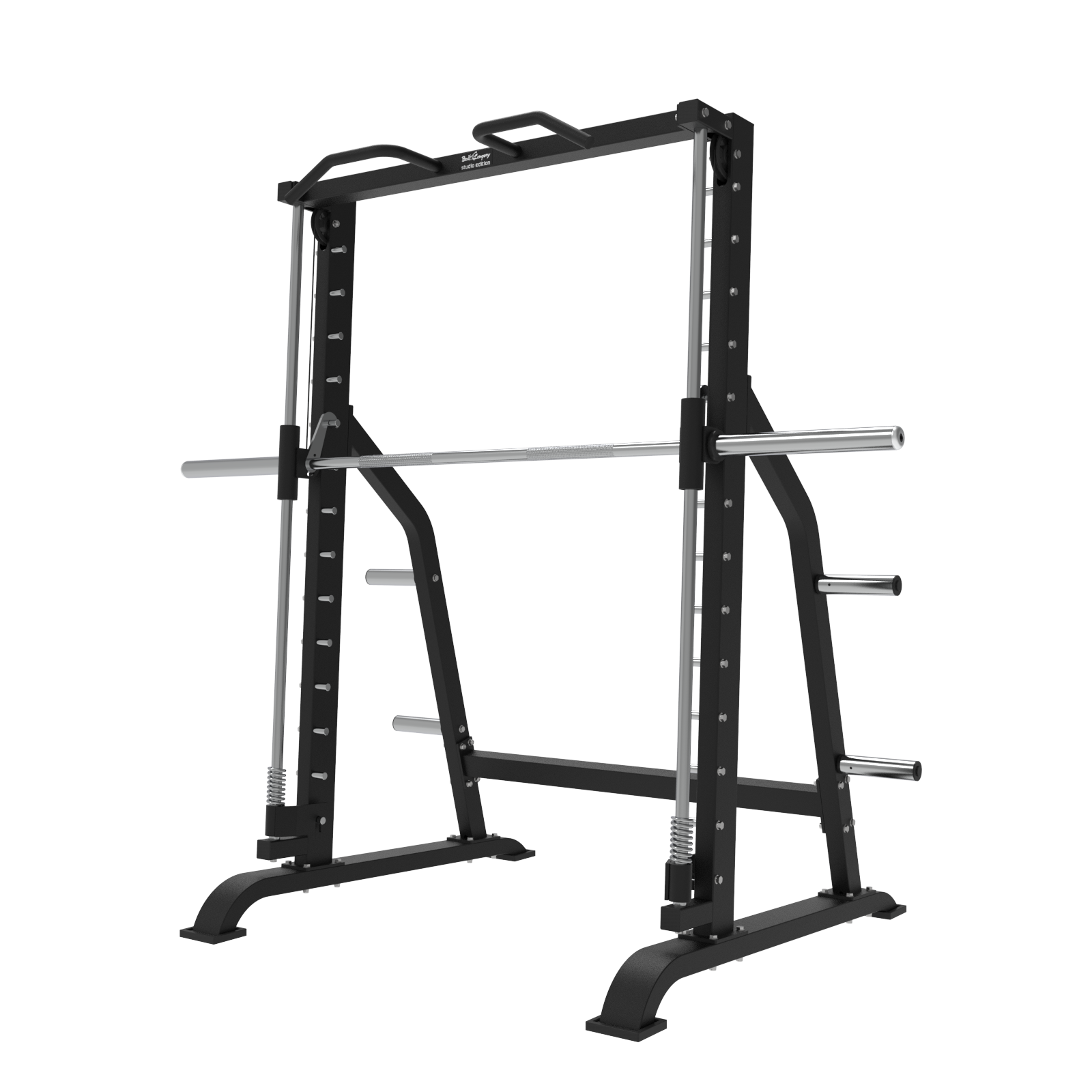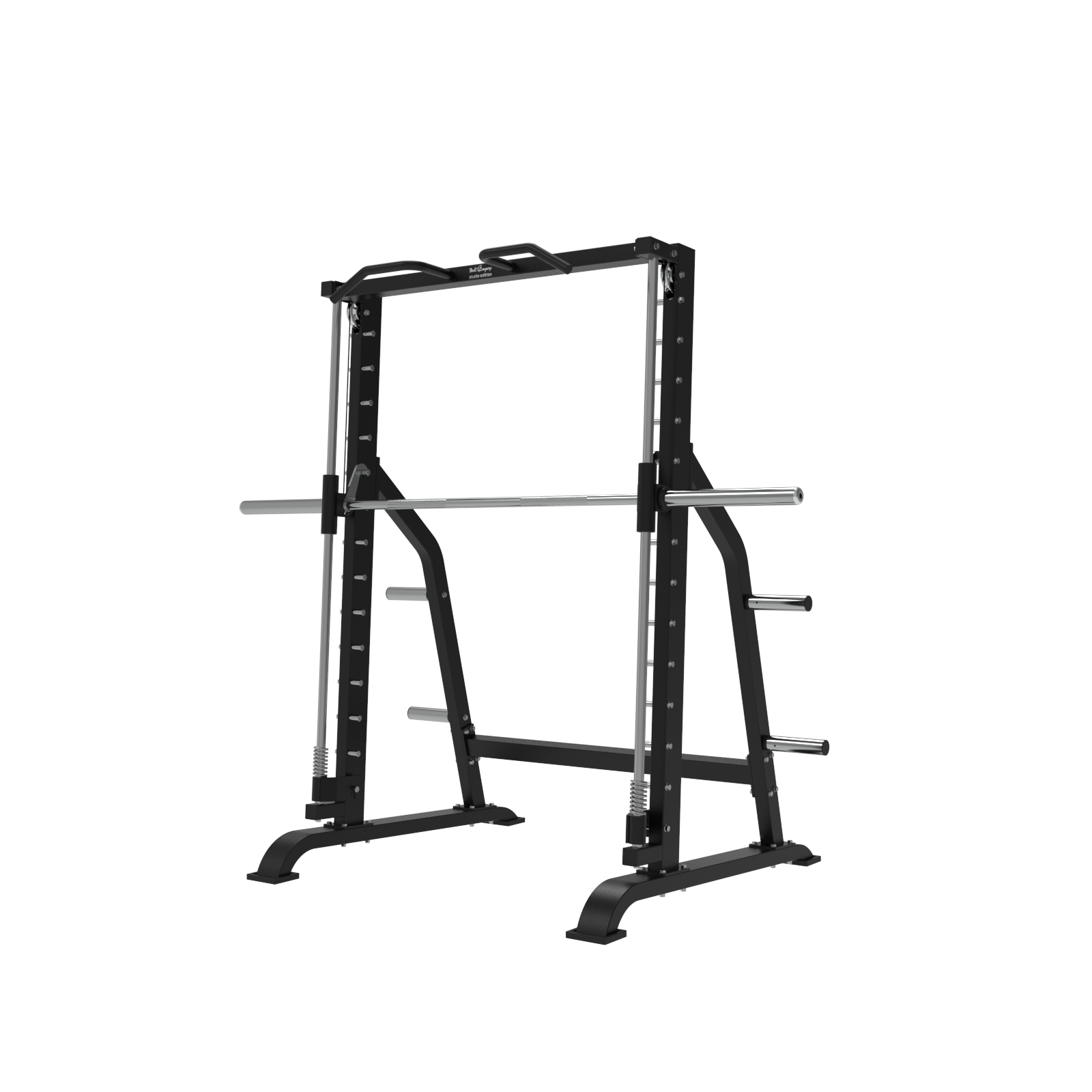 Die Langhantelstange besteht aus Vollstahl, ist verchromt und gerändelt. Die Linearlagerführung sorgt in Verbindung mit den hochwertigen, blauen Aluminium-Rollen für einen reibungslosen Trainingsablauf.
